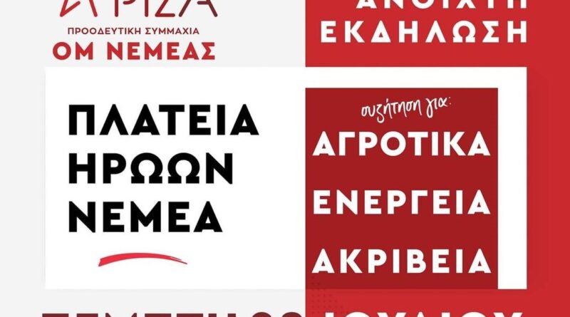 Η Οργάνωση Μελών Νεμέας σας προσκαλεί στην ανοικτή εκδήλωση – συζήτηση για τα αγροτικά ζητήματα, την ακρίβεια και την ενέργεια, την Πέμπτη 28 Ιουλίου στις 8:30 μ.μ. στην πλατεία Ηρώων στη Νεμέα.