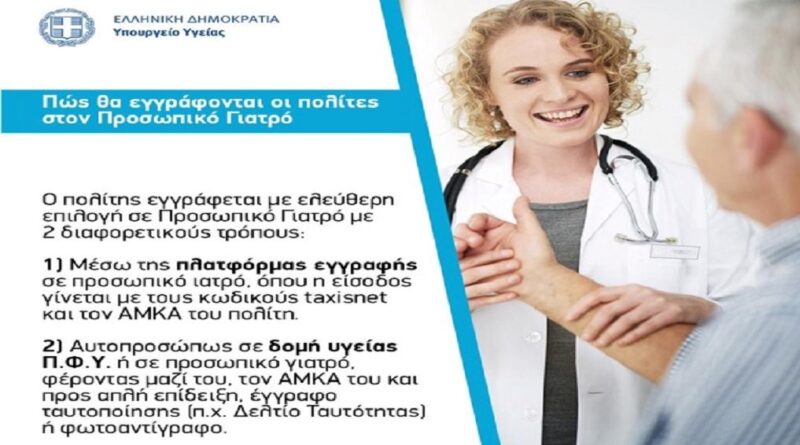 Η εγγραφή σε προσωπικό γιατρό, σύμφωνα με το ΑΠΕ-ΜΠΕ, πραγματοποιείται ηλεκτρονικά, είτε από τον πολίτη μέσω της πλατφόρμας εγγραφής πολιτών, είτε από το διοικητικό και λοιπό προσωπικό των δημόσιων φορέων παροχής υπηρεσιών υγείας της ΠΦΥ, ή τους προσωπικούς ιατρούς.