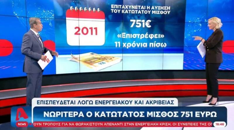 Σύμφωνα με το ρεπορτάζ του Alpha η αύξηση του κατώτατου μισθού στα 751 ευρώ, ενδέχεται να ανακοινωθεί από τον Κυριάκο Μητσοτάκη από τη ΔΕΘ, κάτι που αφορά περίπου 600.000 εργαζόμενους.