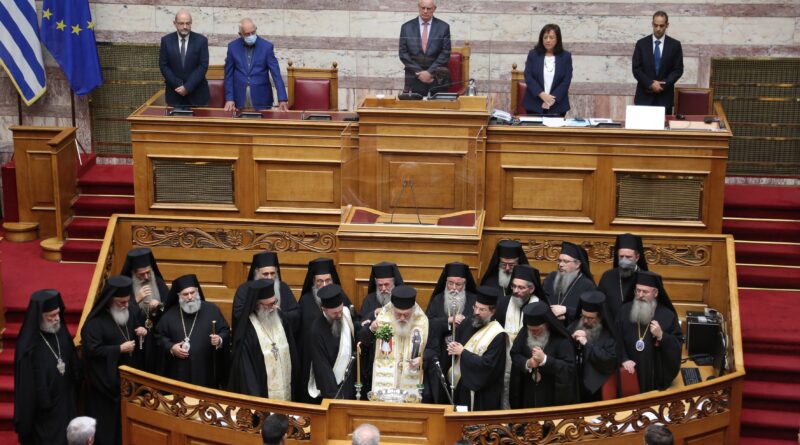 Η καθιερωμένη τελετή Αγιασμού για την έναρξη των εργασιών της Δ΄ Συνόδου της ΙΗ΄ Κοινοβουλευτικής Περιόδου πραγματοποιήθηκε σήμερα, στην αίθουσα συνεδριάσεων της Ολομέλειας της Βουλής, από τον Μακαριώτατο Αρχιεπίσκοπο Αθηνών και Πάσης Ελλάδος κ. Ιερώνυμο και τα μέλη της Διαρκούς Ιεράς Συνόδου.