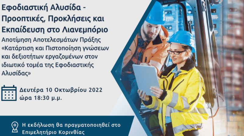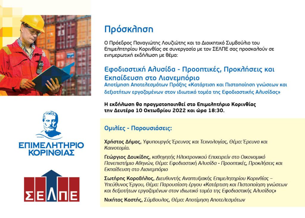 Την Δευτέρα  10 Οκτωβρίου 2022 και ώρα 18:30 θα πραγματοποιηθεί  ενημερωτική  εκδήλωση με θέμα: Εφοδιαστική Αλυσίδα – Προοπτικές , Προσκλήσεις και Εκπαίδευση στο Λιανεμπόριο, στο Επιμελητήριο Κορινθίας σε συνεργασία με τον ΣΕΛΠΕ και το Επιμελητήριο Κορινθίας.