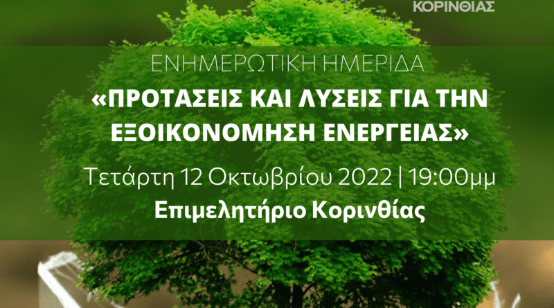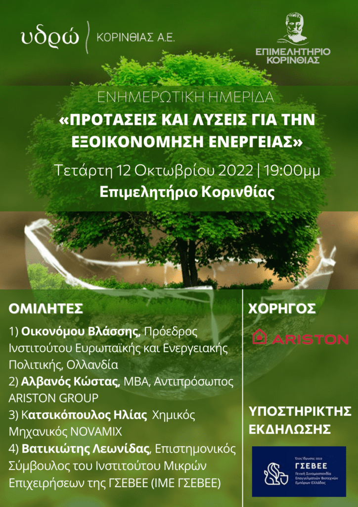 Ο Πρόεδρος Παναγιώτης Λουζιώτης και τα μέλη του Διοικητικού Συμβουλίου του Επιμελητηρίου Κορινθίας στο πλαίσιο του σχεδιασμού σειράς ενημερωτικών εκδηλώσεων για ενεργειακά θέματα, σας προσκαλούν στην ενημερωτική ημερίδα που συνδιοργανώνει με την ΥΔΡΩ ΚΟΡΙΝΘΙΑΣ Α.Ε., με θέμα: «ΠΡΟΤΑΣΕΙΣ ΚΑΙ ΛΥΣΕΙΣ ΓΙΑ ΤΗΝ ΕΞΟΙΚΟΝΟΜΗΣΗ ΕΝΕΡΓΕΙΑΣ» την Τετάρτη 12 Οκτωβρίου 2022 και ώρα 19:00μμ.