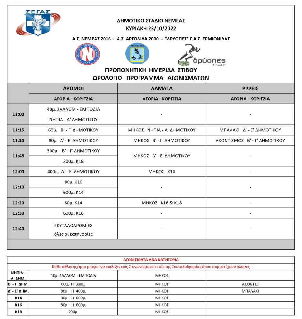 Η αθλητική εκδήλωση θα πραγματοποιηθεί στο ανακαινισμένο δημοτικό στάδιο Νεμέας με τη συμμετοχή των σωματείων Α.Σ. ΑΡΓΟΛΙΔΑ 2000, ΔΡΥΟΠΕΣ Γ.Α.Σ.ΕΡ.