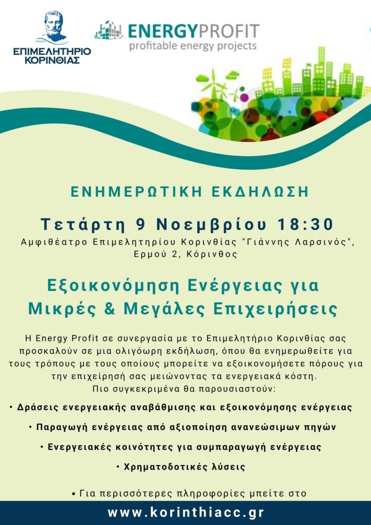 Η Energy Profit σε συνεργασία με το Επιμελητήριο Κορινθίας σας προσκαλούν σε μια ολιγόωρη εκδήλωση, όπου θα ενημερωθείτε για τους τρόπους με τους οποίους μπορείτε να εξοικονομήσετε πόρους για την επιχείρησή σας μειώνοντας τα ενεργειακά κόστη.