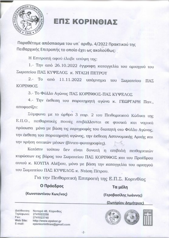 Η πειθαρχική επιτροπή έκρινε ότι δεν μπορούν να υποστηριχθούν οι καταγγελίες του Κυψέλου και ομόφωνα αθώωσε τον ΠΑΣ Κόρινθος.