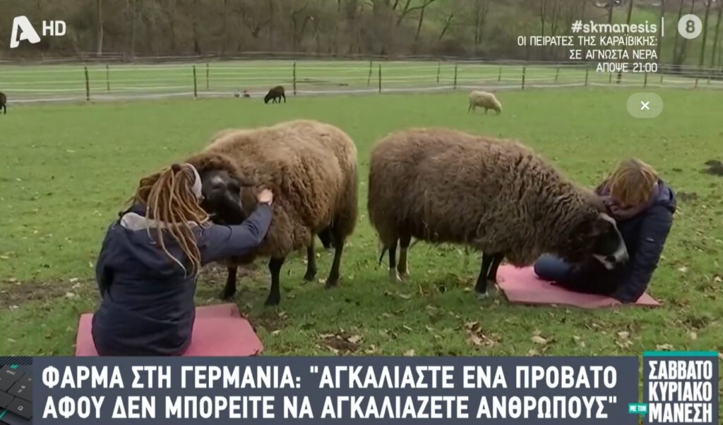 Με το μότο «Αγκαλιάστε ένα πρόβατο, αφού δεν μπορείτε να αγκαλιάζετε ανθρώπους …» παρουσιάστηκε σε μεγάλο τηλεοπτικό κανάλι το ρεπορτάζ του κ Μάνεση «ΣαββατοΚύριακο με τον Μάνεση» για την θεραπευτική διαδικασία με το αγκάλιασμα προβάτων στην Γερμανία, όπου οι φάρμες προσφέρουν οργανωμένα αυτήν την εμπειρία.