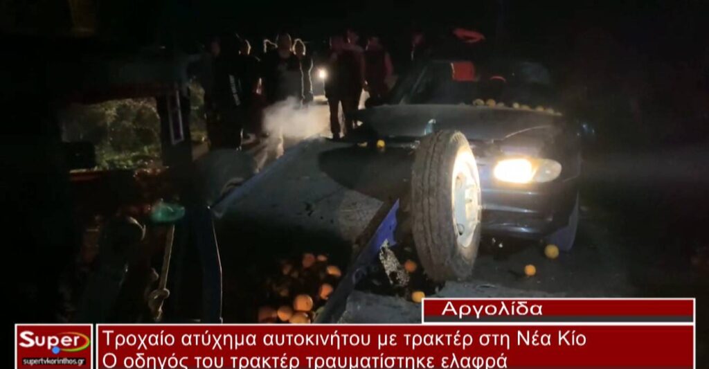 Τροχαίο ατύχημα σημειώθηκε -υπό άγνωστες συνθήκες σε αγροτικό δρόμο κοντά στη θέση “Μπομπέικα” στη Νέα Κίο του Δήμου Άργους-Μυκηνών, μεταξύ ενός τρακτέρ με ρυμούλκα που μετέφερε πορτοκάλια και ενός Ι.Χ επιβατικού.