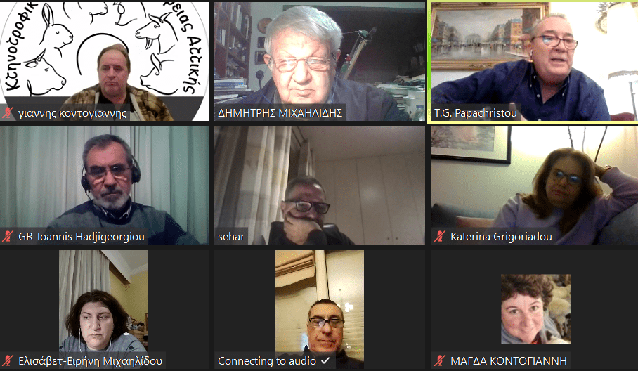 Με πρόσκληση του προέδρου του Κτηνοτροφικού Συλλόγου Περιφέρειας Αττικής κ Γιάννη Κοντογιάννη, την Τετάρτη, 11/1/2023, η Γραμματέας του Συλλόγου κα Μάγδα Κοντογιάννη (6932094231, κτηνοτρόφος, Μενίδι Αττικής) οργάνωσε την συνάντηση στην πλατφόρμα zoom, που υποστηρίζεται από το Skywalker-Εργασία στην Ελλάδα, στην οποία συμμετείχαν οι: Δρ Θωμάς Παπαχρήστου, καθ Ιωάννης ΧατζηΓεωργίου, καθ Σέρκο Χαρουτουνιάν, Δρ Κατερίνα Γρηγοριάδου & καθ Δημήτριος Κουρέτας, με συντονιστή τον κ Δημήτριο Μιχαηλίδη (ΑγροΝέα, AgroBus) και γραμματεία την κα Ελισάβετ Μιχαηλίδου (γεωργός, Ν. Σκοπός). Την γραμματειακή υποστήριξη της πρωτοβουλίας είχε η κα Αθηνά Μιχαηλίδου (Πρόβειο ΚΟΡΔΑΛΗ, Μέγαρα).