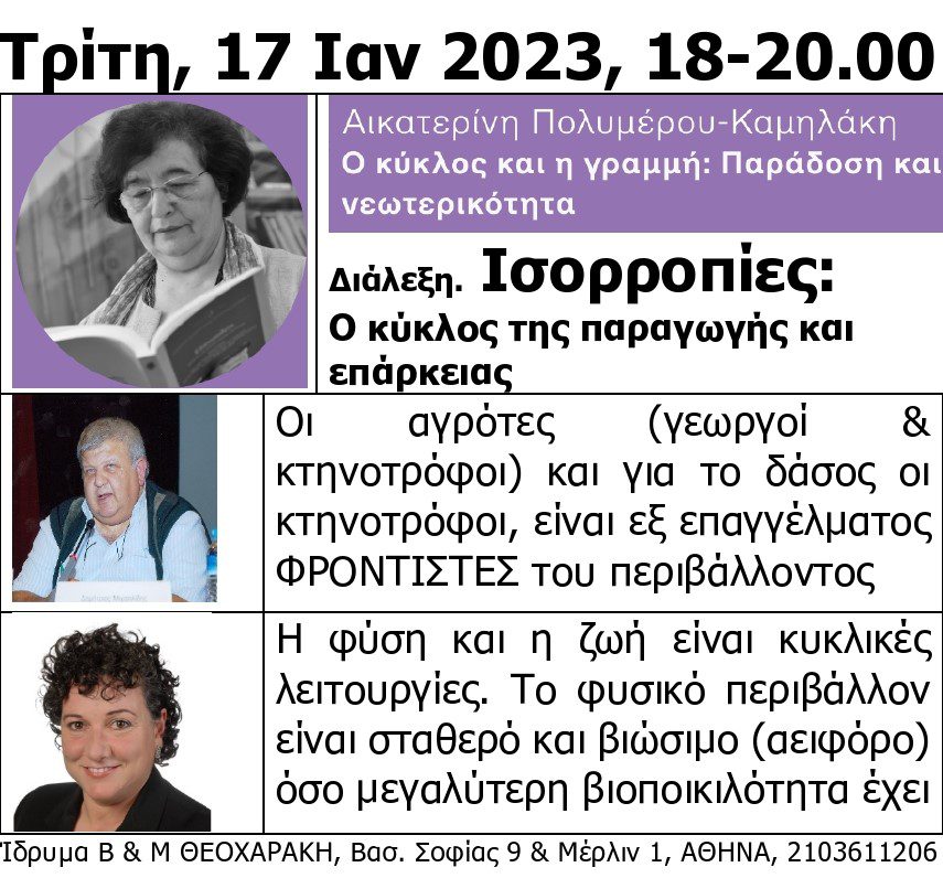 Και βέβαια όλοι μπορούν να παρακολουθήσουν δωρεάν ή και να πάνε στο Ίδρυμα Θεοχαράκη (Βασ. Σοφίας 9 & Μέρλιν, ΑΘΗΝΑ) για να συμμετέχουν στην διάλεξη της Δρ Αικατερίνης Καμηλάκη όπου η κα Μάγδα Κοντογιάννη (κτηνοτρόφος, γραμματέας του Κτηνοτροφικού Συλλόγου Περιφέρειας Αττικής, υπεύθυνη του δικτύου Αγροτισσών) θα μιλήσει με θέμα: Η φύση και η ζωή είναι κυκλικές λειτουργίες. Το φυσικό περιβάλλον είναι σταθερό και βιώσιμο (αειφόρο) όσο μεγαλύτερη βιοποικιλότητα έχει. Διαδικτυακά την συζήτηση μπορεί να την παρακολουθήσει δωρεάν όποιος επιθυμεί την Τρίτη, 17 Ιαν 2023, στις 18.00 στο https://us06web.zoom.us/j/82740849755?pwd=YTZ2ZDRMRDN2b21QTm92ZEhDVzhtQT09&fbclid=IwAR28Y5DwFLCMM8PDaWP5qLPoFdcBYK6ysG6Z1TmcJZ3RrXyX8VS8WGHihQo#success.