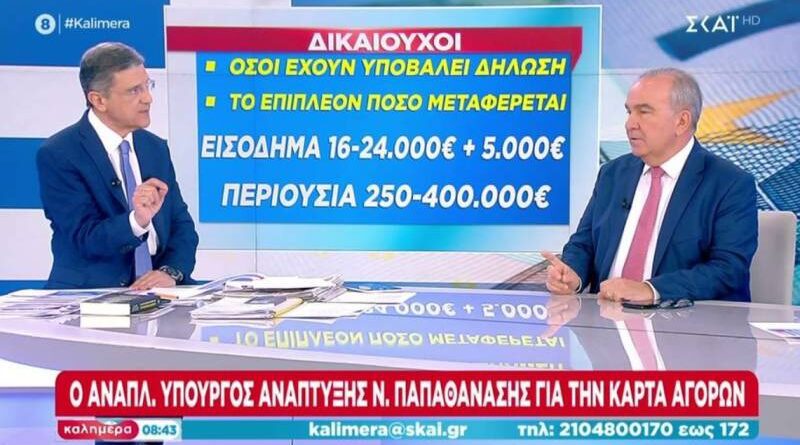«Από 1η Φεβρουαρίου ξεκινάει η κάρτα αγορών και μέχρι το τέλος Φεβρουαρίου θα έχουν μπει τα χρήματα στους λογαριασμούς, ή στην άϋλη κάρτα, με τους 8.400.000 δικαιούχους να λαμβάνουν 22 ευρώ έως 100 ευρώ το μήνα», τόνισε στον ΣΚΑΙ ο αναπληρωτής υπουργός Ανάπτυξης και Επενδύσεων, Νίκος Παπαθανάσης.