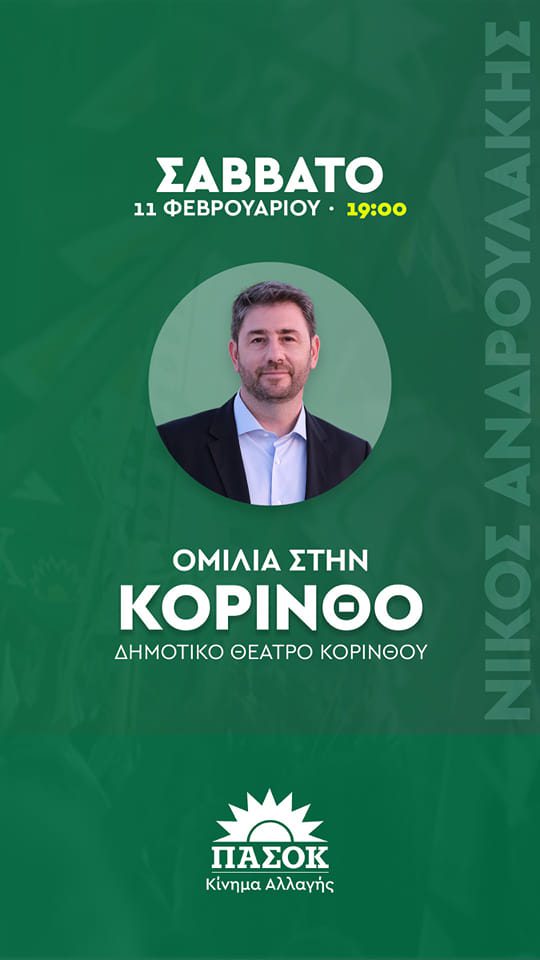 Τo Σάββατο 11/2/2023 o πρόεδρος του ΚΙΝΑΛ-ΠΑΣΟΚ Νίκος Ανδρουλάκης θα βρίσκεται στην Κόρινθο, σύμφωνα με την ανακοίνωση της Νομαρχιακής Επιτροπής, και θα πραγματοποιήσει ομιλία στο Δημοτικό Θέατρο Κορίνθου (Δαμασκηνού 57) στις 19:00.