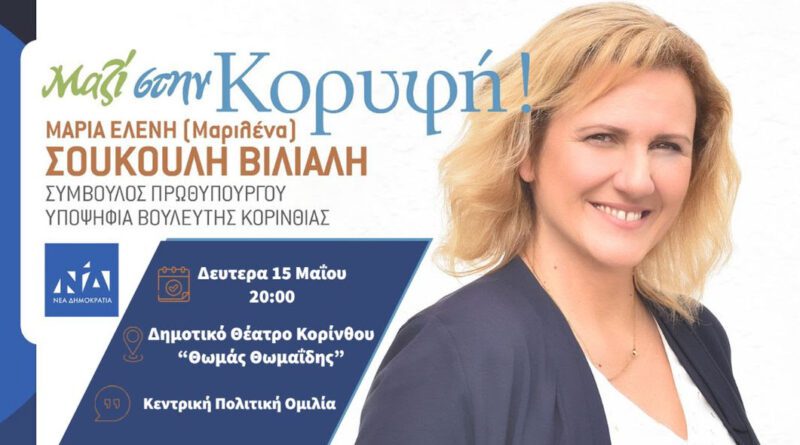 Τη Δευτέρα 15 Μαΐου στις 20:00 στο Δημοτικό Θέατρο Κορίνθου “Θωμάς Θωμαϊδης” θα πραγματοποιηθεί η Κεντρική Πολιτική Ομιλία της υποψήφιας Βουλευτή με την ΝΔ Μαριλένας Σούκουλη Βιλιάλη.