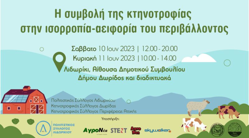 Ο Πολιτιστικός Σύλλογος Λιδωρικίου, ο Κτηνοτροφικός Σύλλογος Δωρίδας και ο Κτηνοτροφικός Σύλλογος Περιφέρειας Αττικής, προσκαλούν όλους/ες στο υβριδικό συνέδριο στο Λιδωρίκι με θέμα: «Η συμβολή της κτηνοτροφίας στην ισορροπία-αειφορία του περιβάλλοντος» το Σάββατο, 10/6/2023, 12.00-20.00 στο https://us02web.zoom.us/j/86992836792?pwd=NEh6eFVzd2puRVh6TGl5Y1BuM1NFUT09 & στο https://us02web.zoom.us/j/86816529416?pwd=TWFpdTY5ZEs4Vk1sZkgzTlliaTF3QT09 την Κυριακή, 10-14.00, 11/6/2023, με την ευκαιρία της Παγκόσμιας Ημέρας Περιβάλλοντος. Πληρ. κα Αργυρώ Λαγγουράνη-6948403759, κ Νίκος Ασημακόπουλος-6944156447 & κα Μάγδα Κοντογιάννη-6932094231.