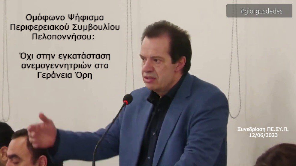 Ομόφωνο ψήφισμα υποστήριξης στον αγώνα της Επιτροπής Κατοίκων «Όχι ανεμογεννήτριες στα Γεράνεια» εξέδωσε το Περιφερειακό Συμβούλιο Πελοποννήσου κατά τη συνεδρίαση της Δευτέρας, 12ης Ιουνίου, μετά από εισήγηση του επικεφαλής της παράταξης “ΝΕΟΙ ΔΡΟΜΟΙ για την Πελοπόννησο”, Γιώργου Δέδε.