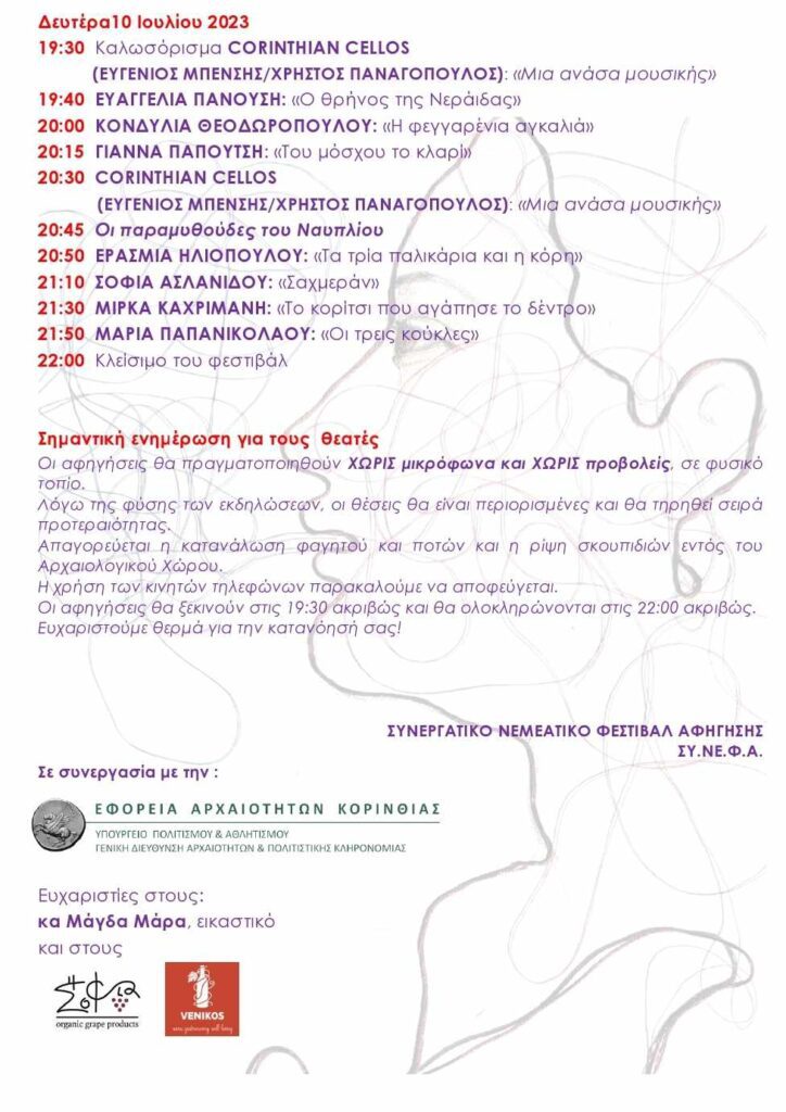 - Θα πραγματοποιηθούν δυο κεντρικές εκδηλώσεις με διαδοχικές αφηγήσεις την Κυριακή 9 Ιουλίου και τη Δευτέρα 10 Ιουλίου στον Προαύλιο χώρο του Μουσείου Αρχαίας Νεμέας (ώρα έναρξης 7.30 μ. μ.)