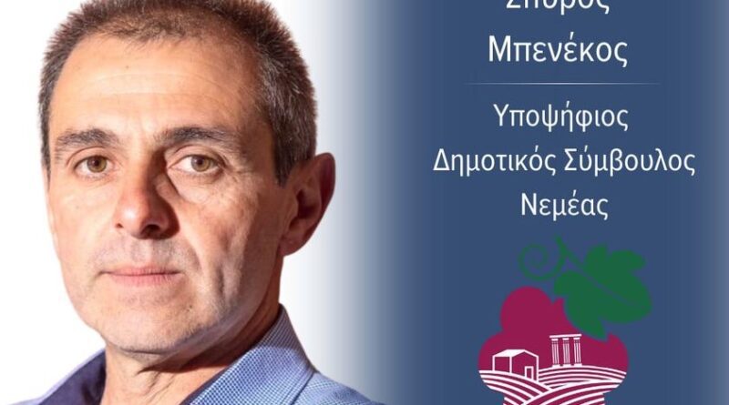 Ονομάζομαι Μπενέκος Σπύρος γεννήθηκα και μεγάλωσα στην Νεμέα, είμαι πατέρας δύο παιδιών. Εργάζομαι ως αγρότης και έχω διατελέσει δύο φορές ως αντιδήμαρχος.
