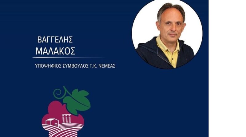 Βαγγέλης Μαλακός: Υποψήφιος σύμβουλος Δημοτικής Κοινότητας Νεμέας με τον συνδυασμό ”Για μια ΝΕΑ ΝΕΜΕΑ”