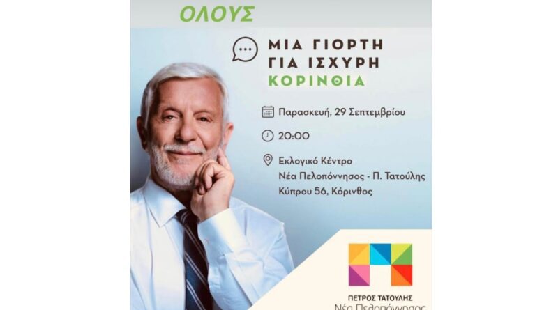 “Σας προσκαλώ στα εγκαίνια του Εκλογικού Κέντρου της «Νέας Πελοποννήσου» την Παρασκευή 29 Σεπτεμβρίου και ώρα 20:00 στην οδό Κύπρου 56 στην Κόρινθο.”