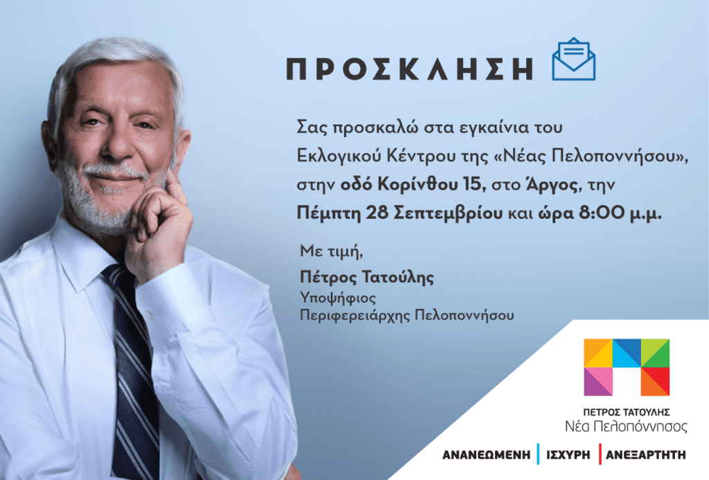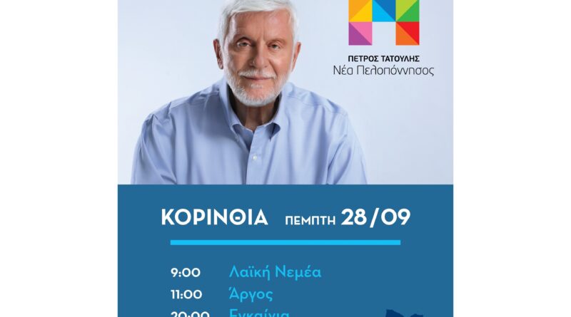 Ο επικεφαλής της «Νέας Πελοποννήσου» και υποψήφιος Περιφερειάρχης Πελοποννήσου Πέτρος Τατούλης θα παραστεί με τους υποψήφιους Περιφερειακούς Συμβούλους στην Νεμέα και στο Άργος σήμερα Πέμπτη 28 Σεπτεμβρίου 2023.