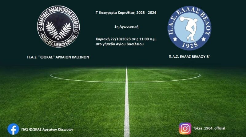 σας περιμένουμε όλους την Κυριακή 22 Οκτωβρίου 2023 και ώρα 11:00 π.μ. στο γήπεδο Αγίου Βασιλείου, όπου θα διεξαχθεί η 1η αγωνιστική της Γ’ Κατηγορίας Κορινθίας 2022-2023 μεταξύ της ομάδας μας, Π.Α.Σ. “ΦΩΚΑΣ” Αρχαίων Κλεωνών και του Π.Α.Σ. Βέλου Β’.