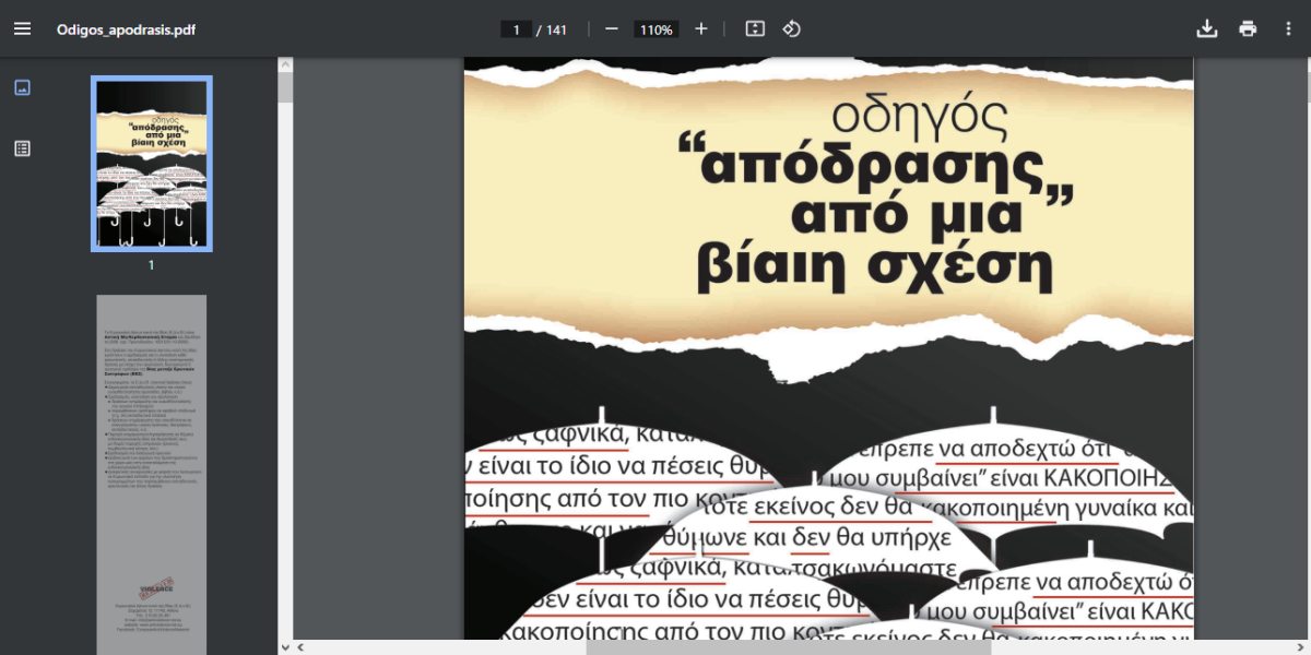 Επιπλέον, καθοδηγεί μια γυναίκα σε κακοποιητική σχέση στο να οργανώσει το δικό της σχέδιο Απόδρασης, φωτίζοντας όλα τα πιθανά προβλήματα και τις εμπλοκές που μπορεί να υπάρξουν, καθώς και όλες τις υπηρεσίες στις οποίες μπορεί να απευθυνθεί, οι οποίες επικαιροποιημένες βρίσκονται στην ιστοσελίδα του φορέα, όπου υπάρχει και το βιβλίο σε ψηφιακή μορφή.