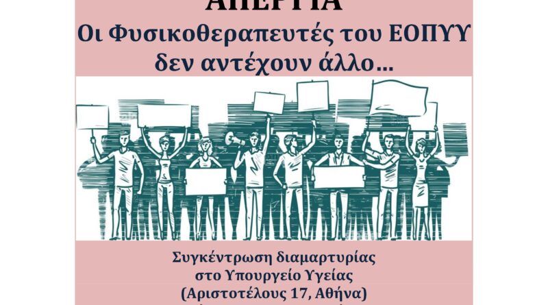 Συγκέντρωση διαμαρτυρίας του Πανελλήνιου Συλλόγου Φυσικοθεραπευτών έξω από το Υπουργείο Υγείας την Τετάρτη 25 Οκτωβρίου, στις 12:00 π.μ.