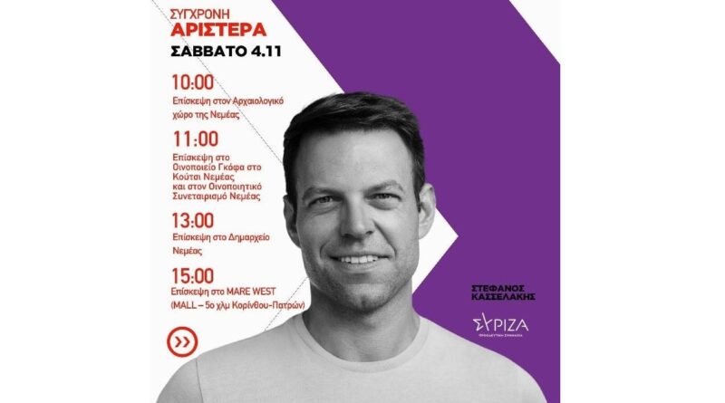 Ο πρόεδρος του ΣΥΡΙΖΑ-Προοδευτική Συμμαχία, Στέφανος Κασσελάκης θα πραγματοποιήσει επίσκεψη στην Νεμέα και την Κόρινθο το Σάββατο 4 Νοεμβρίου 2023.