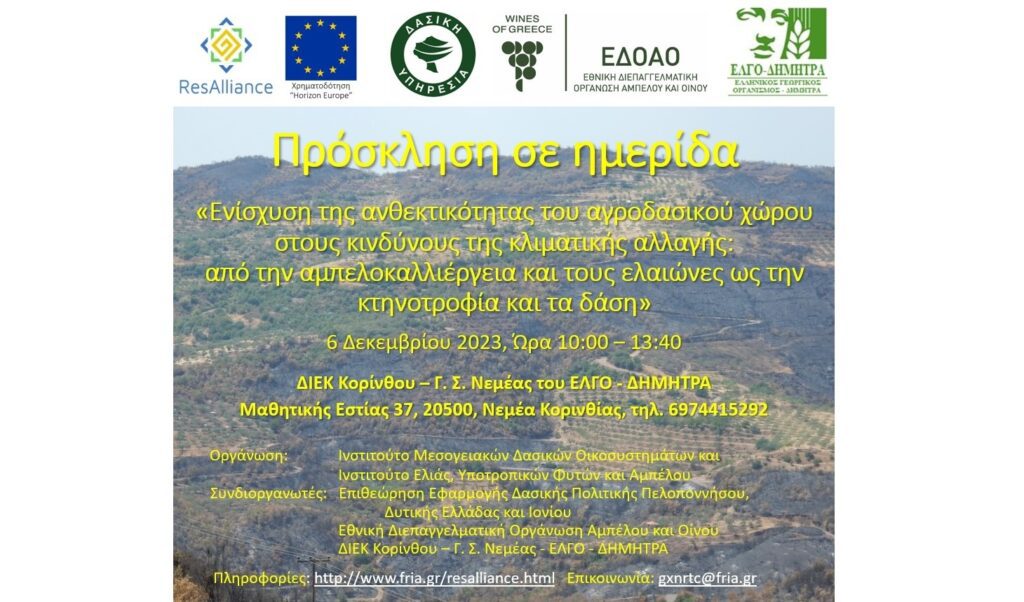 Ημερίδα με θέμα την ενίσχυση της ανθεκτικότητας του αγροδασικού χώρου (αμπελοκαλλιέργεια, ελαιώνες, κτηνοτροφία, δάση) στους κινδύνους της κλιματικής αλλαγής πραγματοποιείται στις 6 Δεκεμβρίου στην Νεμέα. Πρόκειται για την τρίτη εκδήλωση στο πλαίσιο υλοποίησης του έργου ResAlliance που αποσκοπεί στην δημιουργία ενός Μεσογειακού δικτύου ανταλλαγής και διάδοσης γνώσης και καλών πρακτικών ( LandNet ) με στόχο την βελτίωση της ανθεκτικότητας του τοπίου.
