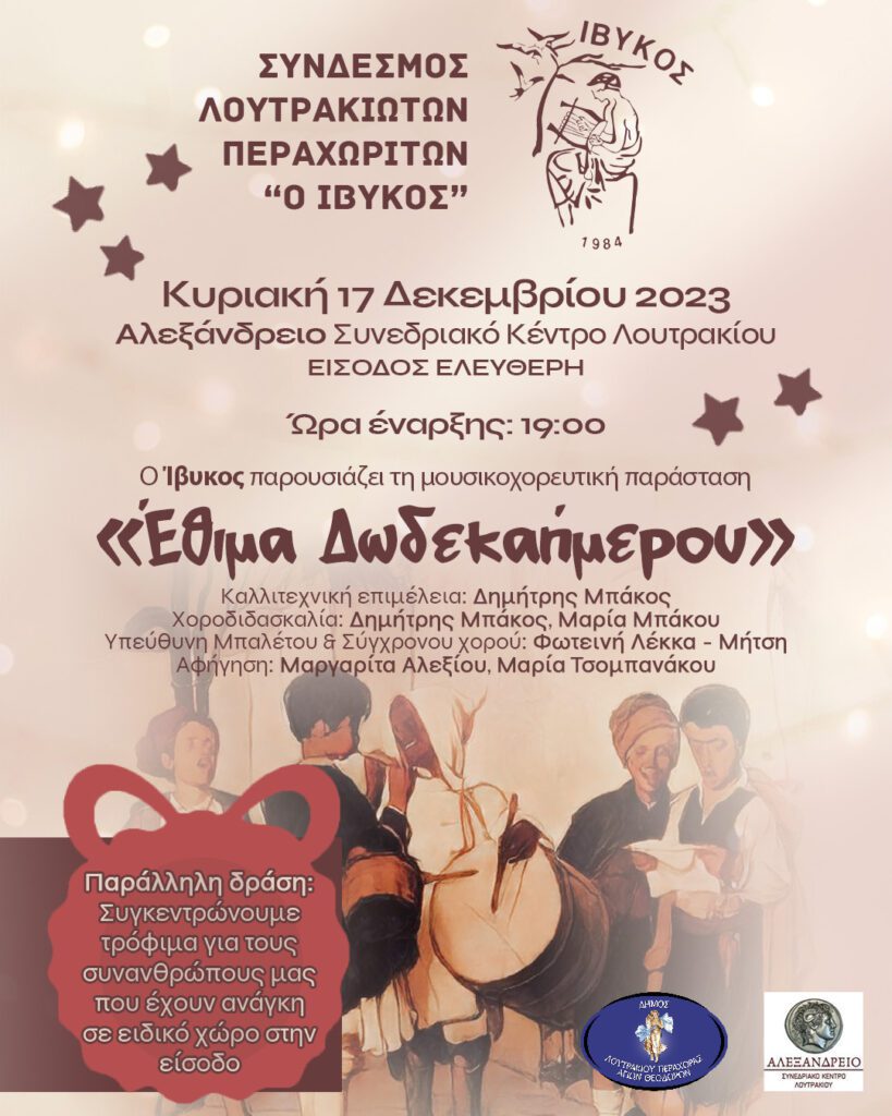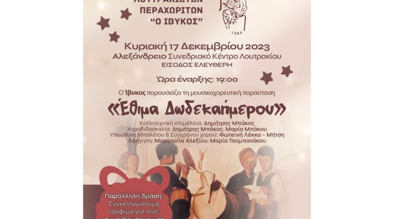 Ο Σύνδεσμος Λουτρακιωτών – Περαχωριτών – «Ο ΙΒΥΚΟΣ» με πολλή χαρά και υπερηφάνεια σας προσκαλεί στη Χριστουγεννιάτικη μουσικοχορευτική του παράσταση με θέμα «Έθιμα Δωδεκαήμερου», την Κυριακή 17/12/2023 & ώρα 19:00’μ.μ., στο Αλεξάνδρειο Συνεδριακό Κέντρο Λουτρακίου.