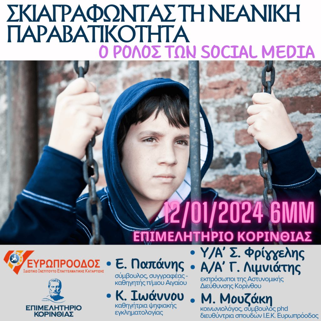 Με αφορμή την αύξηση των δεικτών παραβατικότητας των νέων στη χώρα μας, το ΙΕΚ ΕΥΡΩΠΡΟΟΔΟΣ σε συνεργασία με το Επιμελητήριο Κορινθίας διοργανώνουν στην Κόρινθο ημερίδα με θέμα “Σκιαγραφώντας τη νεανική παραβατικότητα: ο ρόλος των social media”. Πρόκειται για ένα εξαιρετικά ανησυχητικό φαινόμενο που οι αιτίες του είναι πολυδιάστατες, επηρεάζοντας το σύνολο της κοινωνικής ζωής και έχοντας σαφές αντίκτυπο μακροπρόθεσμα στην ίδια την κοινωνία.