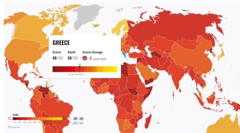 Με πτώση τριών βαθμών (49 βαθμοί το 2023 από 52 βαθμούς το 2022 & 59η θέση για το 2023 από 51η θέση το 2022), η Ελλάδα, σύμφωνα με τους συντάκτες της έκθεσης, Διεθνούς Διαφάνειας αντιμετωπίζει κρίση του κράτους δικαίου και συγκεντρώνει τους ίδιους βαθμούς με τη Ναμίμπια και βρίσκεται κάτω από τη Μαλαισία. Η Πολωνία (54) βρίσκεται αρκετά ψηλότερα από την Ελλάδα και η Ουγγαρία (42) χαμηλότερα.
