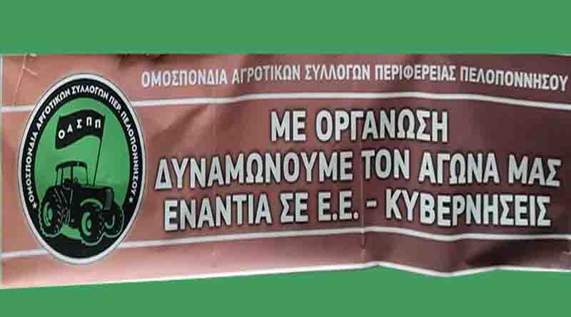 Η Ομοσπονδία Αγροτικών Συλλόγων Περιφέρειας Πελοποννήσου (ΟΑΣΠΠ) καλεί όλες και όλους τους αγρότες – κτηνοτρόφους-μελισσοκόμους και αλιείς της Πελοποννήσου σε συμμετοχή στο πανελλαδικό αγροτικό συλλαλητήριο στο Σύνταγμα στην Αθήνα την Τρίτη 20 Φλεβάρη.