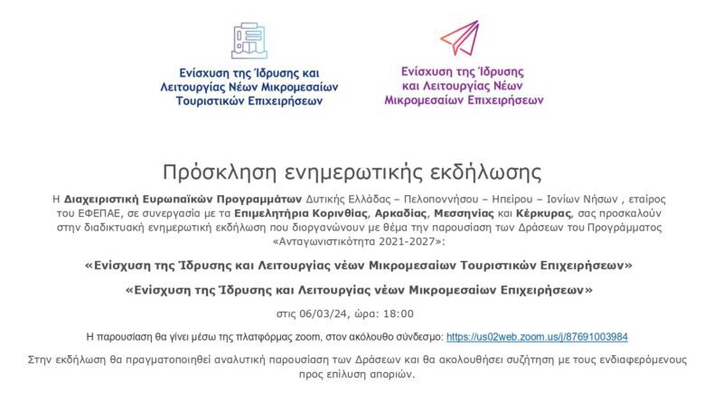 H Διαχειριστική Ευρωπαϊκών Προγραμμάτων Δυτικής Ελλάδας – Πελοποννήσου – Ηπείρου – Ιονίων Νήσων , εταίρος του ΕΦΕΠΑΕ, σε συνεργασία με τα Επιμελητήρια Κορινθίας, Αρκαδίας, Μεσσηνίας και Κέρκυρας, σας προσκαλούν στην διαδικτυακή ενημερωτική εκδήλωση που διοργανώνουν με θέμα την παρουσίαση των Δράσεων του Προγράμματος «Ανταγωνιστικότητα 2021-2027»: