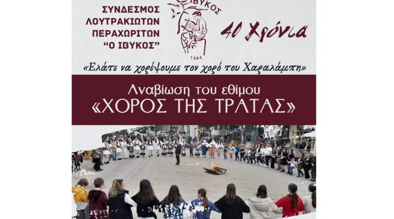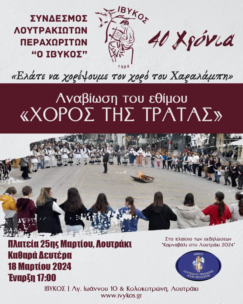 Ο Σύνδεσμος Λουτρακιωτών- Περαχωριτών «Ο Ίβυκος» αναβιώνει και φέτος το έθιμο του Χορού της Τράτας (Χορού του Χαραλάμπη), την Καθαρά Δευτέρα, 18 Μαρτίου 2024 & ώρα 17:00, στην Πλατεία 25ης Μαρτίου, στο Λουτράκι και μας προσκαλεί να συμμετάσχουμε.