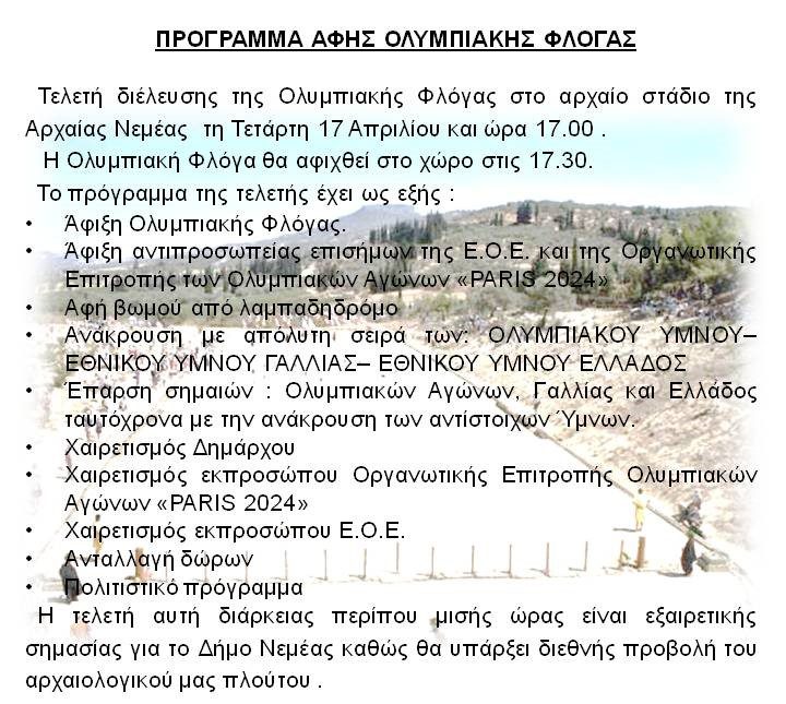To πρόγραμμα Τελετής Αφής της Ολυμπιακής Φλόγας στο Αρχαίο Στάδιο της Αρχαίας Νεμέας