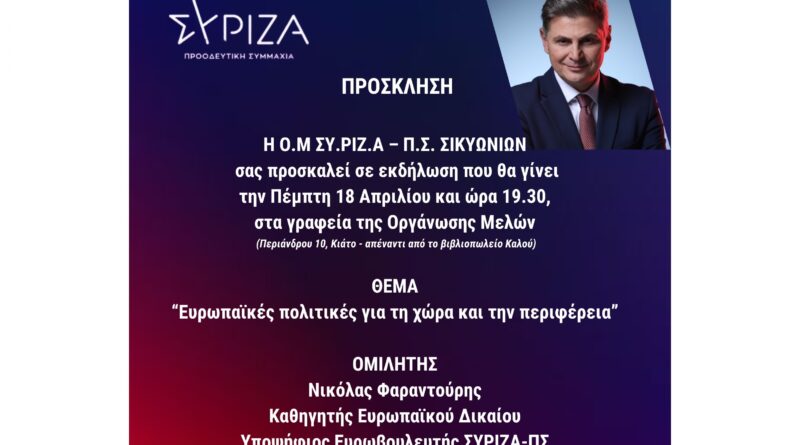 Η Ο.Μ ΣΥ.ΡΙΖ.Α – Π.Σ ΣΙΚΥΩΝΙΩΝ, διοργανώνει εκδήλωση με Θέμα ¨Ευρωπαϊκές πολιτικές για τη χώρα και την περιφέρεια¨ και ομιλητή τον Νικόλα Φαραντούρη καθηγητή Ευρωπαϊκού Δικαίου και Υποψήφιο Ευρωβουλευτή ΣΥΡΙΖΑ-Π.Σ. και σας καλούμε την Πέμπτη 18 Απριλίου και ώρα 19.30, στα γραφεία της Οργάνωσης Μελών, Περιάνδρου 10 Κιάτο (απέναντι από το βιβλιοπωλείο ΚΑΛΟΥ) , όπου ο υποψήφιος Ευρωβουλευτής ΣΥΡΙΖΑ-ΠΣ , ΝΙΚΟΛΑΣ ΦΑΡΑΝΤΟΥΡΗΣ θα κάνει δηλώσεις στα ΜΜΕ.