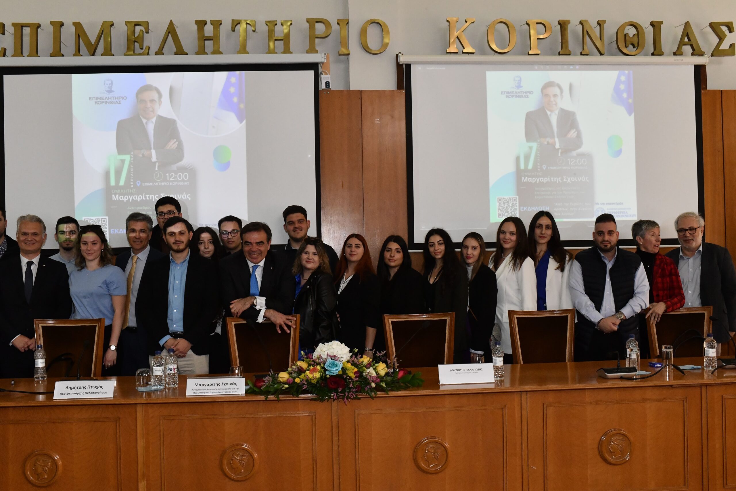 Η παρουσία του κόσμου που κατέκλυσε την αίθουσα του Επιμελητηρίου Κορινθίας καταδεικνύει τη σημασία της εκδήλωσης αυτής για την Κορινθία η οποία δείχνει ότι ενδιαφέρεται ενεργά για τον διάλογο για την Ευρώπη και τιμά έναν σημαντικό αγωνιστή για τα ελληνικά συμφέροντα στην ενωμένη Ευρώπη, τον κ. Μαργαρίτη Σχοινά.