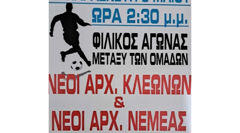 και ώρα 2:30 μ.μ., στο νέο γήπεδο των Αρχαίων Κλεωνών, μεταξύ των ομάδων ΝΕΟΙ ΑΡΧΑΙΩΝ ΚΛΕΩΝΩΝ – ΝΕΟΙ ΑΡΧΑΙΑΣ ΝΕΜΕΑΣ.