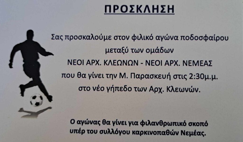 και ώρα 2:30 μ.μ., στο νέο γήπεδο των Αρχαίων Κλεωνών, μεταξύ των ομάδων ΝΕΟΙ ΑΡΧΑΙΩΝ ΚΛΕΩΝΩΝ – ΝΕΟΙ ΑΡΧΑΙΑΣ ΝΕΜΕΑΣ.