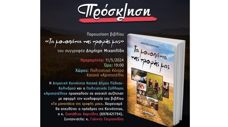 Το Σάββατο, 11 Μαΐου 2024, στις 19.00, στην αίθουσα του Πολιτιστικού Κέντρου ΑΡΙΣΤΟΤΕΛΗΣ, στο χωριό Καταχάς Πιερίας θα παρουσιασθεί το βιβλίο «Τα μονοπάτια της τροφής μας» του Δημήτρη Μιχαηλίδη των εκδόσεων ΣΤΕΝΤΟΡΑΣ.