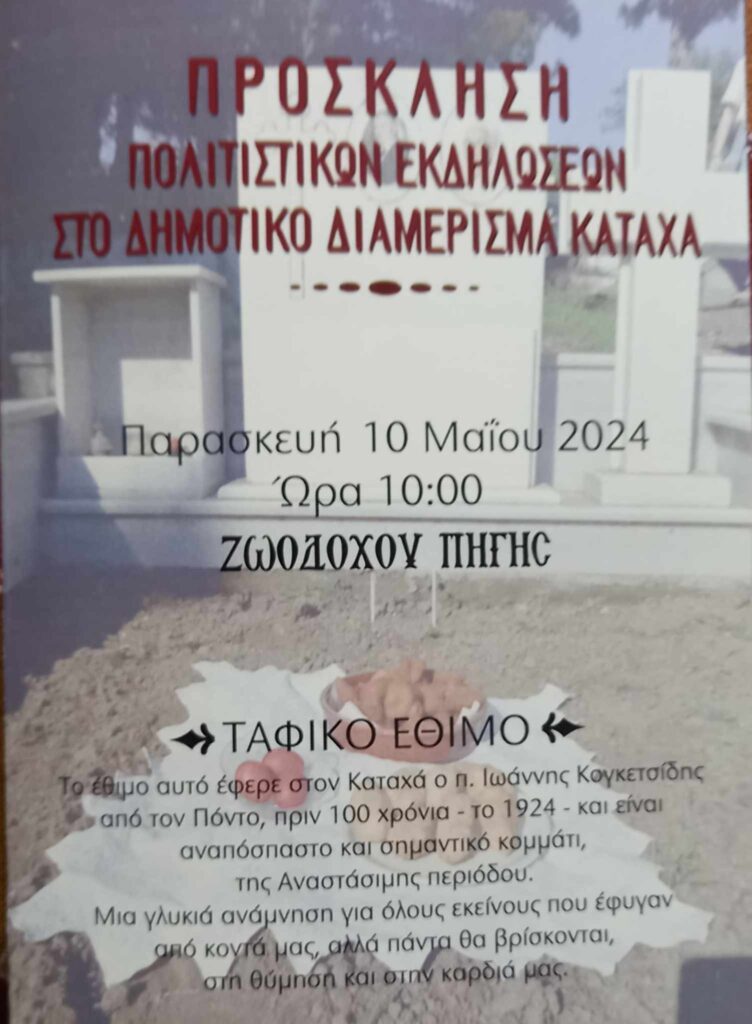 - Παρασκευή, 10/5/2024, στις 10.00, Ταφικό έθιμο στα κοιμητήρια, που καθιερώθηκε στον Καταχά πριν 100 χρόνια.
