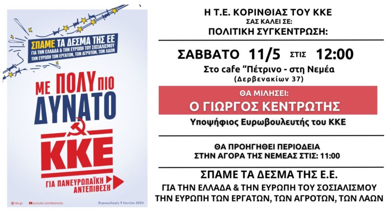 Το Σάββατο 11 Μαΐου στις 11 π.μ. θα περιοδεύσει στην αγορά της Νεμέας ο υποψήφιος Ευρωβουλευτής του ΚΚΕ, Γιώργος Κεντρωτής.