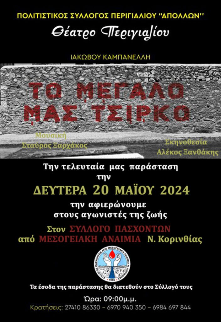 Ο Σύλλογος Πασχόντων από Μεσογειακή Αναιμία Νομού Κορινθίας, σας καλεί στην Θεατρική Παράσταση