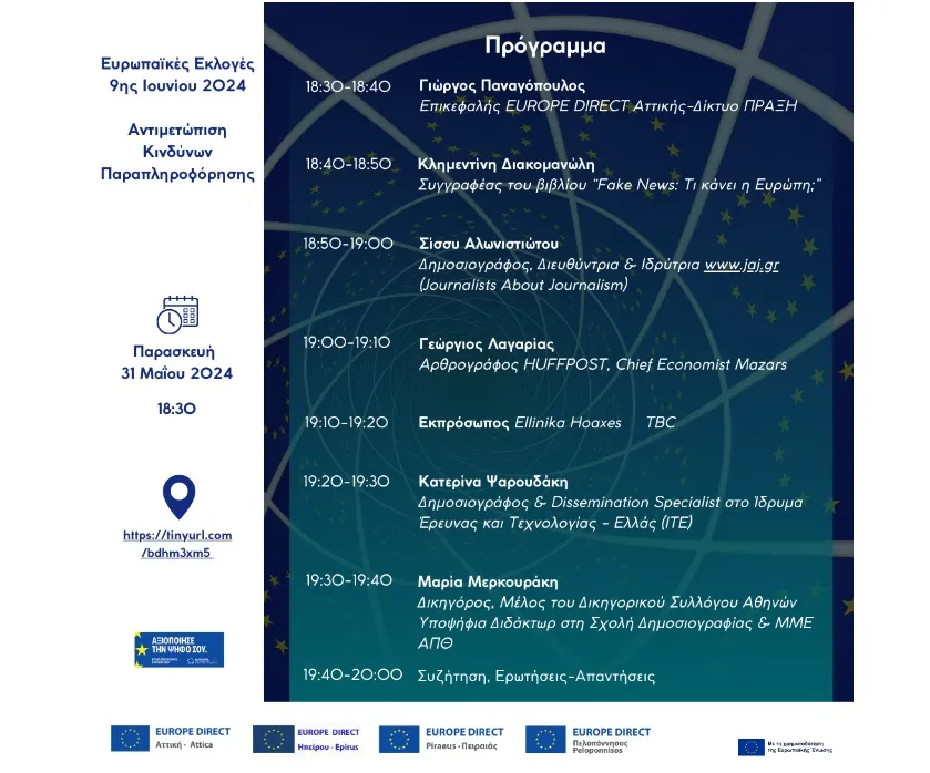 Τα EUROPE DIRECT Αττικής – Δίκτυο Πράξη, Δήμου Πειραιά, Ηπείρου & Πελοποννήσου συνδιοργανώνουν διαδικτυακή εκδήλωση με τίτλο «Ευρωπαϊκές Εκλογές 9ης Ιουνίου 2024 – Αντιμετώπιση Κινδύνων Παραπληροφόρησης», εν όψει των επερχόμενων Ευρωπαϊκών εκλογών, που θα πραγματοποιηθεί την Παρασκευή 31 Μαΐου 2024 και ώρα 18:30.