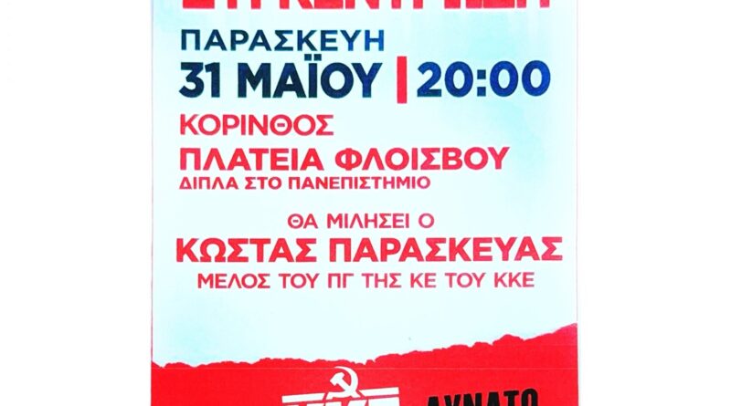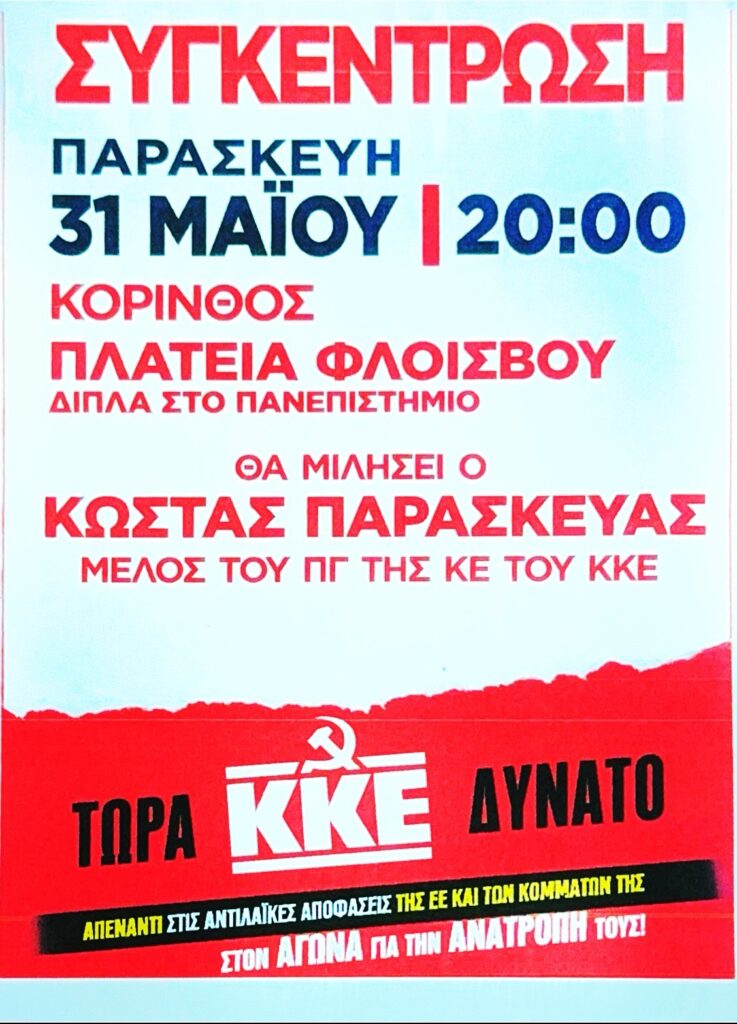 Η Τ.Ε. Κορινθίας του ΚΚΕ σας καλεί σε προεκλογική συγκέντρωση την Παρασκευή 31/5 στις 8 μ.μ. στην Πλατεία Φλοίσβου στην Κόρινθο. Θα μιλήσει ο Κώστας Παρασκευάς, μέλος του Πολιτικού Γραφείου της Κεντρικής Επιτροπής του ΚΚΕ.