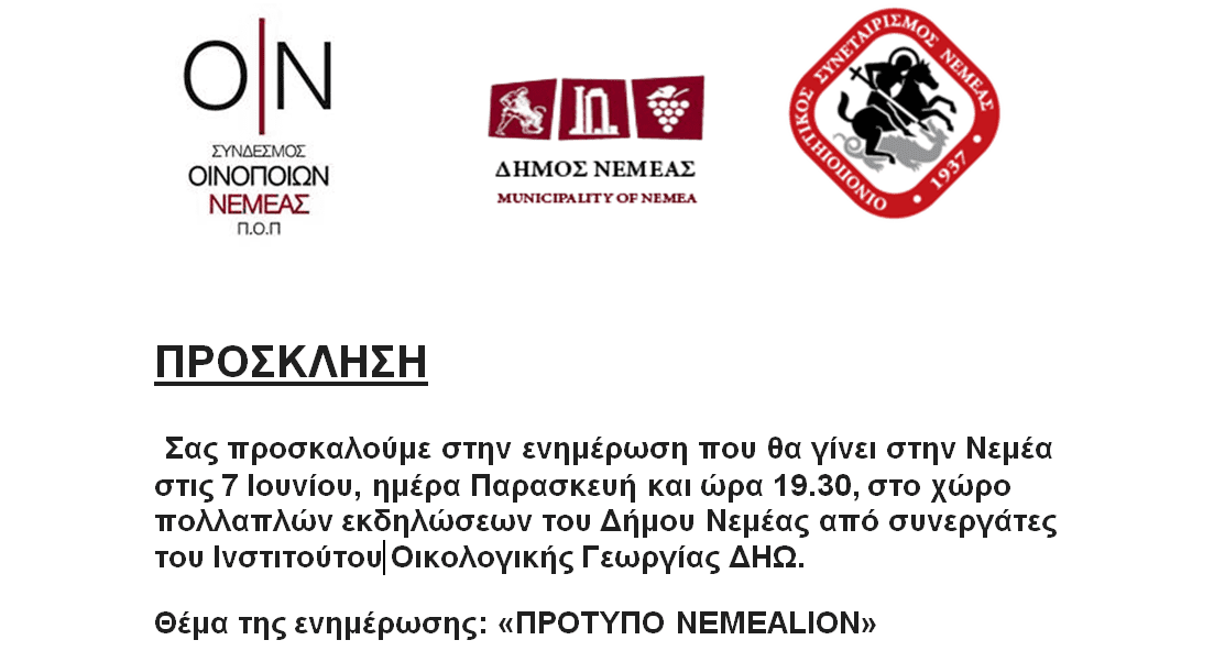 Σας προσκαλούμε στην ενημέρωση που θα γίνει στην Νεμέα στις 7 Ιουνίου, ημέρα Παρασκευή και ώρα 19.30, στο χώρο πολλαπλών εκδηλώσεων του Δήμου Νεμέας από συνεργάτες του Ινστιτούτου Οικολογικής Γεωργίας ΔΗΩ.