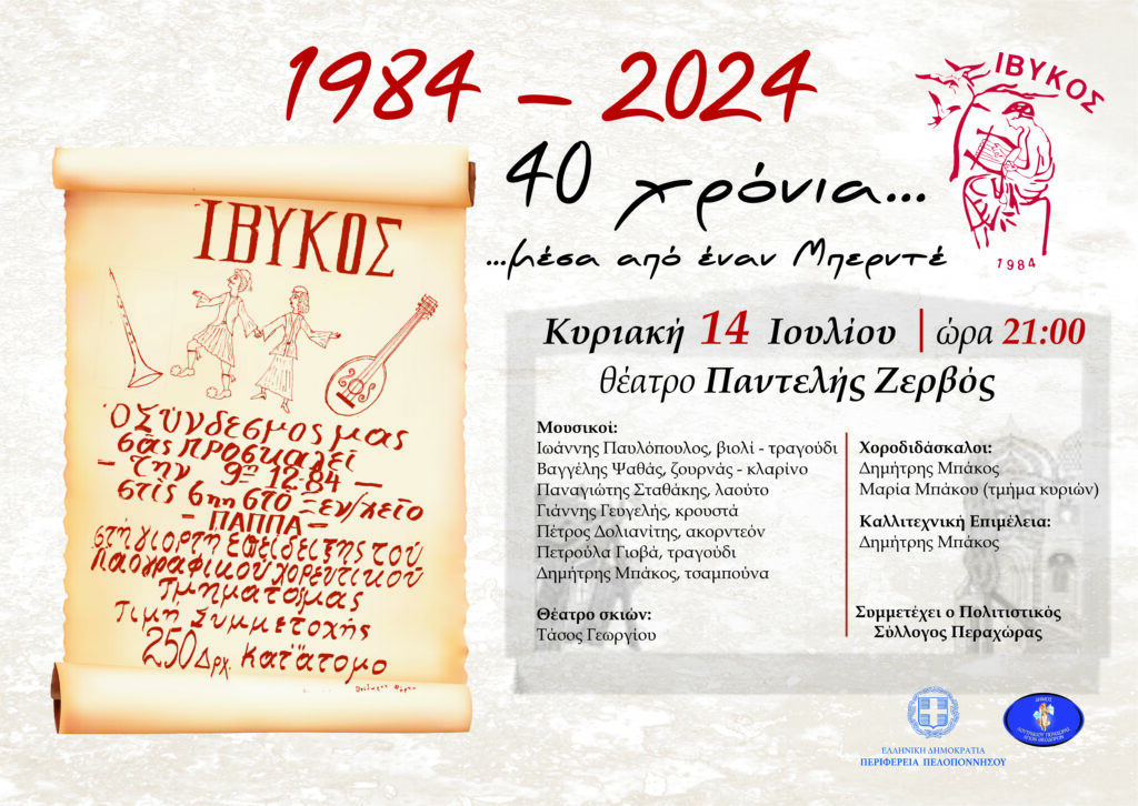 Ο Σύνδεσμος Λουτρακιωτών- Περαχωριτών – “Ο Ίβυκος” συμπληρώνει 40 χρόνια λειτουργίας και, με μεγάλη χαρά, σας προσκαλεί στην μουσικοχορευτική του παράσταση, την Κυριακή 14 Ιουλίου 2024 και ώρα 21.00’ μ.μ.., στο θέατρο Δεξαμενής «Παντελής Ζερβός», στο Λουτράκι.