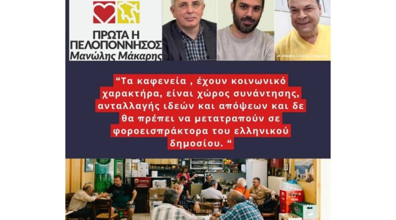Τα καφενεία, έχουν κοινωνικό χαρακτήρα, είναι χώρος συνάντησης, ανταλλαγής ιδεών και απόψεων και δεν θα πρέπει να μετατραπούν σε φοροεισπράκτορα του ελληνικού δημοσίου.