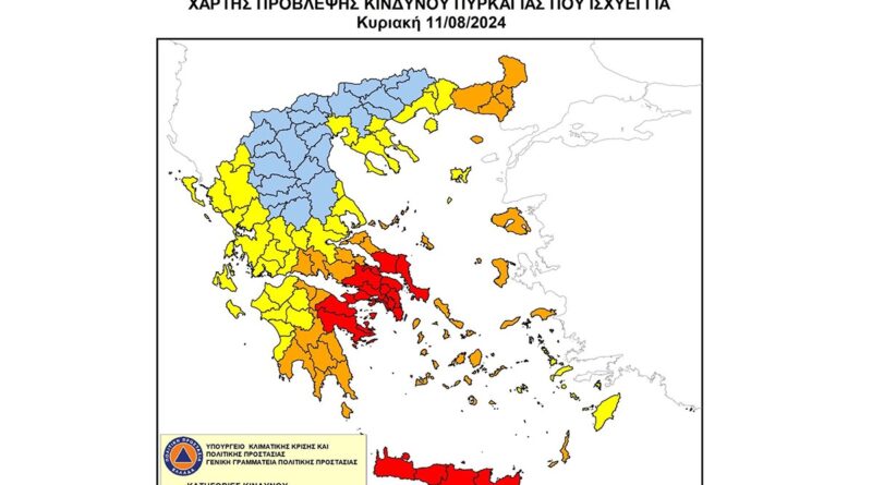 Σύμφωνα με το Χάρτη Πρόβλεψης Κινδύνου Πυρκαγιάς, τον οποίο εκδίδει η Γενική Γραμματεία Πολιτικής Προστασίας του Υπουργείου Κλιματικής Κρίσης & Πολιτικής Προστασίας για την Κυριακή 11 Αυγούστου, σε κατάσταση συναγερμού βρίσκονται οι Νομοί Αργολίδας και Κορινθίας, ενώ προβλέπεται πολύ υψηλός κίνδυνος δασικής πυρκαγιάς (κατηγορία κινδύνου 4) στους Νομούς Αρκαδίας, Μεσσηνίας και Λακωνίας.
