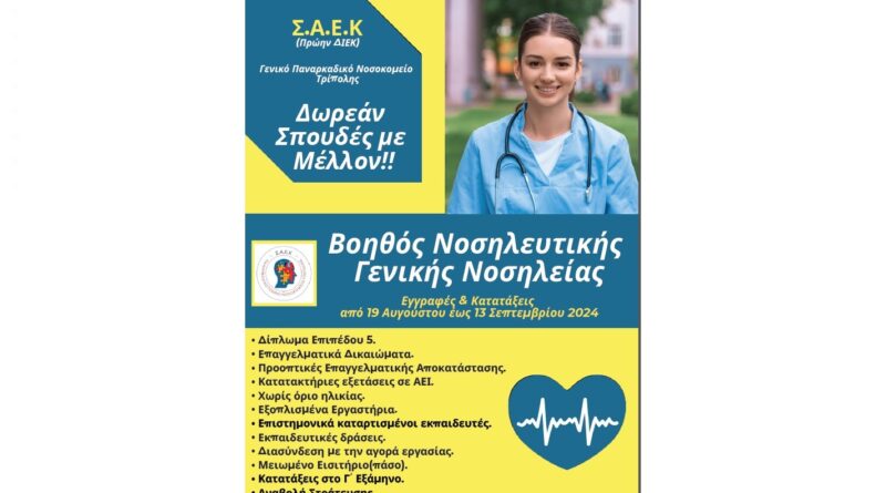 Εγγραφές στη ΣΑΕΚ του Παναρκαδικού Νοσοκομείου Τρίπολης. Γίνε Βοηθός Νοσηλευτικής Γενικής Νοσηλείας!